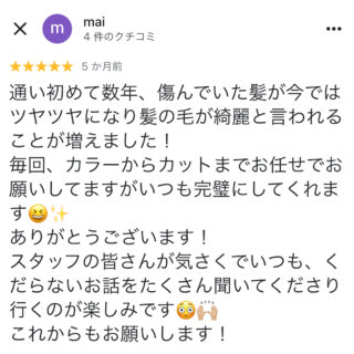 通い初めて数年、傷んでいた髪が今ではツヤツヤになり髪の毛が綺麗と言われることが増えました! 毎回、カラーからカットまでお任せでお願いしてますがいつも完璧にしてくれます😆✨ ありがとうございます! スタッフの皆さ...