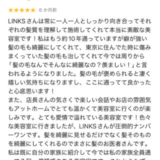LINKSさんは常に一人一人としっかり向き合ってそれぞれの髪質を理解して施術してくれて本当に素敵な美容室です!私はもう約10年通っていますが癖が強い髪の毛も綺麗にしてくれて、東京に住んでた時に傷みまくっていた髪の毛も治してくれて今では周りか...