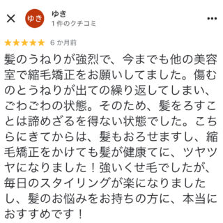 髪のうねりが強烈で、今までも他の美容室で縮毛矯正をお願いしてました。傷むのとうねりが出ての繰り返してしまい、ごわごわの状態。そのため、髪をろすことは諦めざるを得ない状態でした。こちらにきてからは、髪もおろせますし、縮毛矯正をかけても髪が健康...