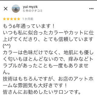 もう6年通っています! いつも私に似合ったカラーやカットに仕上げてくださり、とても信頼しています(^^) カラーは色味だけでなく、地肌にも優しく匂いもほとんどないので、痒みなどトラブルがあったことも一度もありません。 技術はもちろんですが、...