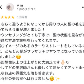 こちらに通うようになってから周りの人に髪の毛を褒めてもらう事が増えました! カウンセリングがとても丁寧で、髪の状態を見ながら最適な方法で施術を行ってくれます。 痛むイメージのあるカラーやストレートをしているのに、どんどん髪がサラサラ+ツヤツ...