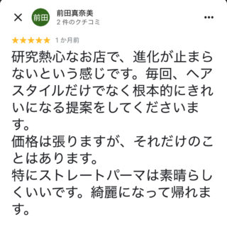 研究熱心なお店で、進化が止まらないという感じです。毎回、ヘアスタイルだけでなく根本的にきれいになる提案をしてくださいます。 価格は張りますが、それだけのことはあります。 特にストレートパーマは素晴らしくいいです。綺麗になって帰れます。