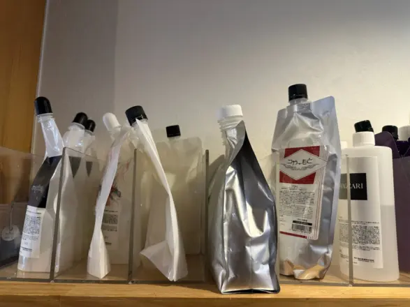 LINKSでは、頭皮から数ミリ浮かせて薬剤を塗布する“ゼロテク”を徹底。 頭皮への刺激を防ぎながらも、美しい発色と艶感を実現します。 さらに、シャンプー台では炭酸泉で丁寧に薬剤を洗い流し、頭皮や髪に残留させないことで刺激を極限まで軽減しています。