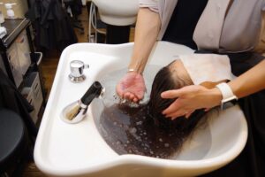 シャンプー台で薬剤をしっかり流し、炭酸泉で頭皮と髪に残留しないようにケア。さらに中間処理で栄養を補給し、次の工程に備えます。